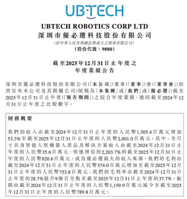 3月31日,港股头部机器人企业优必选发布2025年全年业绩报告。财报显示,2025年优必选实现收入20.01亿元,同比增长53.3%;毛利为7.54亿元,同比增长101.6%;净亏损7.898亿元;归母净亏损7.03亿元,亏损幅度有所收窄。