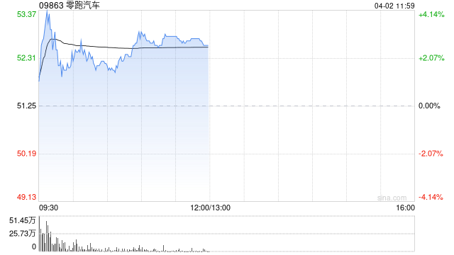 零跑汽车(09863)盘中涨超3%,截至发稿,股价上涨2.93%,现报52.75港元,成交额4.29亿港元。